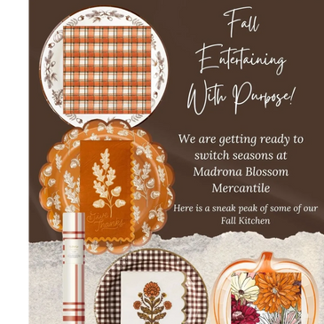 We have you covered for your fall entertaining needs. Plates, napkins, runners, specialty foods and more